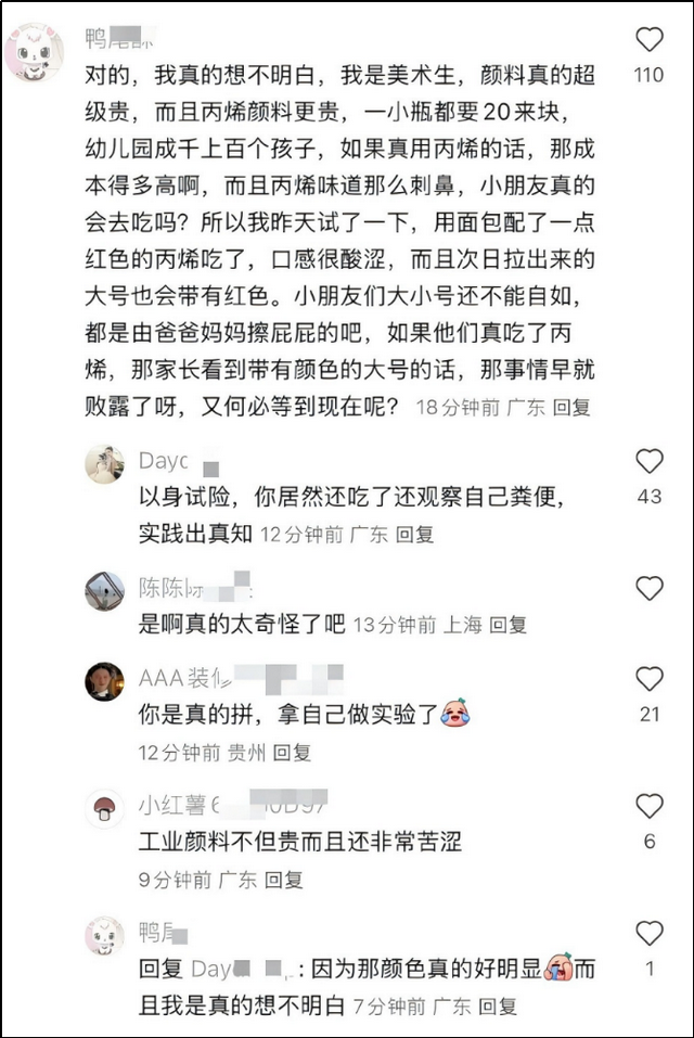 幼儿园成百个学生用彩绘颜料反而是成本更高,行不通的。而工业原料量大且便宜,连成年人也毫不察觉,这就是网上所说的最让人头疼的“蠢人灵机一动”的情况。